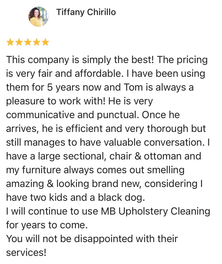 What truly sets MB Upholstery Cleaning apart is their attention to detail in removing deep-seated dirt, stains, and allergens that ordinary cleaning methods often miss. Their advanced techniques penetrate fabric fibers, lifting away contaminants while maintaining the fabric’s integrity. To top it all off, MB Upholstery Cleaning doesn’t just stop at cleanliness—they leave every piece of furniture feeling and smelling refreshed with a light, invigorating lemon deodorant. This final touch not only enhances the ambiance of your space but also assures you that your upholstery isn’t just clean, it’s truly revitalized. For unmatched quality, fabric expertise, and a fresh finish, MB Upholstery Cleaning remains the clear choice for customers who demand the best